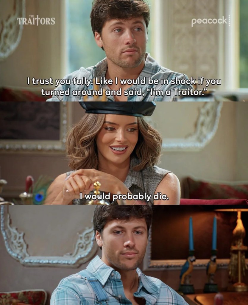 Rob R.’s physical features weren’t the only contributing factors to his trustworthiness. He also made direct, piercing eye contact with her, built trust through play like when he carried her over his shoulder in a challenge, and was consistent in his positive regard for her throughout the entirety of the game, all contributing to her false sense of trust. Meta-analyses of trustworthiness demonstrate that shared context and interpersonal cues strongly shape trusting decisions (Hancock et al.). Maura admitted that their Love Island tenure was an instant shared context that led her to believe she could trust him, though even she herself sounded skeptical of this logic as she was admitting this fact at the Traitors Reunion. Rob R was also really great at the interpersonal cues shared between himself and the other players of the game. He was often seen leaning into conversation, carrying an open, active-listening body posture, and making direct eye contact with his fellow castmates, all projecting trustworthiness to others.